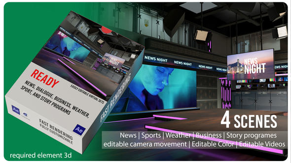 Virtual Studio MDT 01 is a remarkable photo-realistic virtual studio that caters to various program types such as news, dialogue, business, weather, sport, and story programs. With Full HD Resolution Preview, this studio offers an immersive experience for your audience. The demo features required Element 3D plugins, maps, and cinema 4D files, allowing for seamless integration and customization. You can easily change the presenter and edit camera videos to match your specific needs.